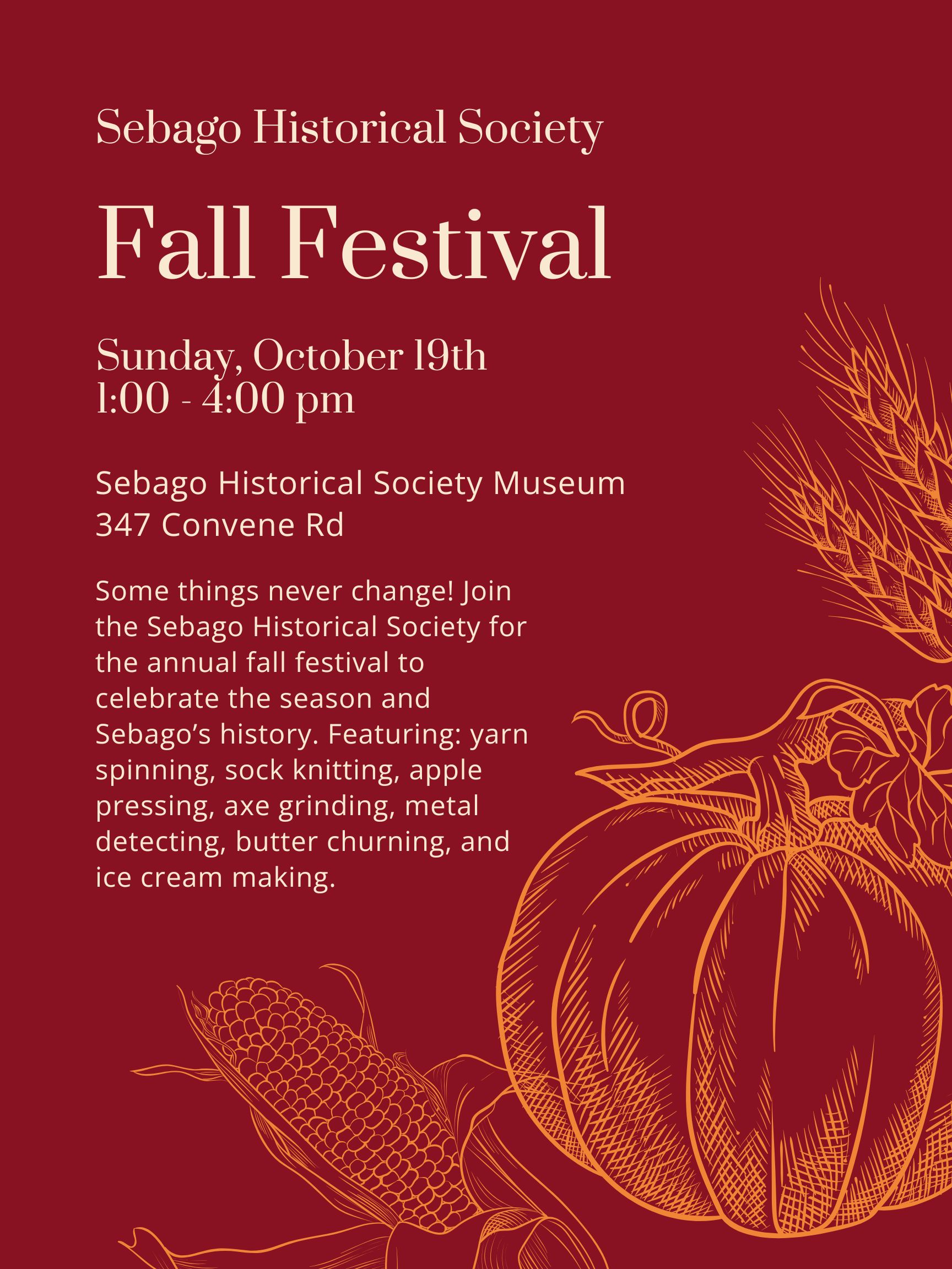 Sat, Sept 22, 2018 • 1:00 - 4:00pm At our museum, 347 Convene Rd, Sebago
